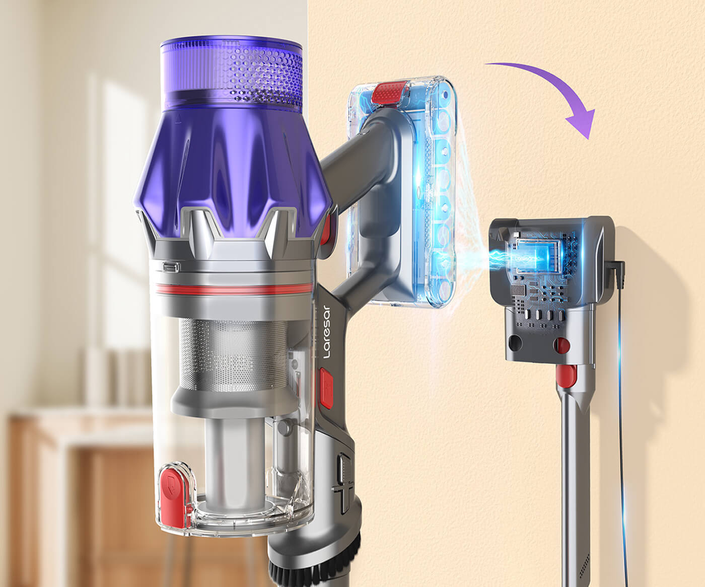 Laresar Vantage 7 är utrustad med ett kraftfullt batteri (7 x 2500 mAh) som ger en driftstid på upp till 60 minuter på en enda laddning. Det gör det enkelt att grundligt rengöra även större hem! Laddningstiden är dessutom endast cirka 4–5 timmar.